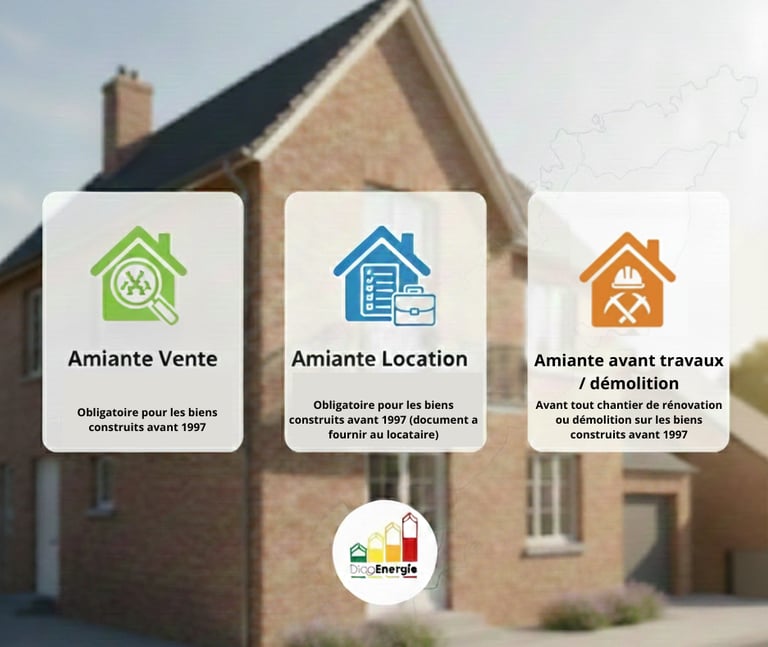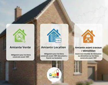 Les exigences réglementaires pour l'Amiante varient non seulement selon le projet immobilier, mais aussi selon la nature du diagnostic. L'Amiante est soumis à des règles strictes pour tous les biens construits avant le 1er janvier 1997 à Habarcq et dans les communes du Sud-Ouest d'Arras.